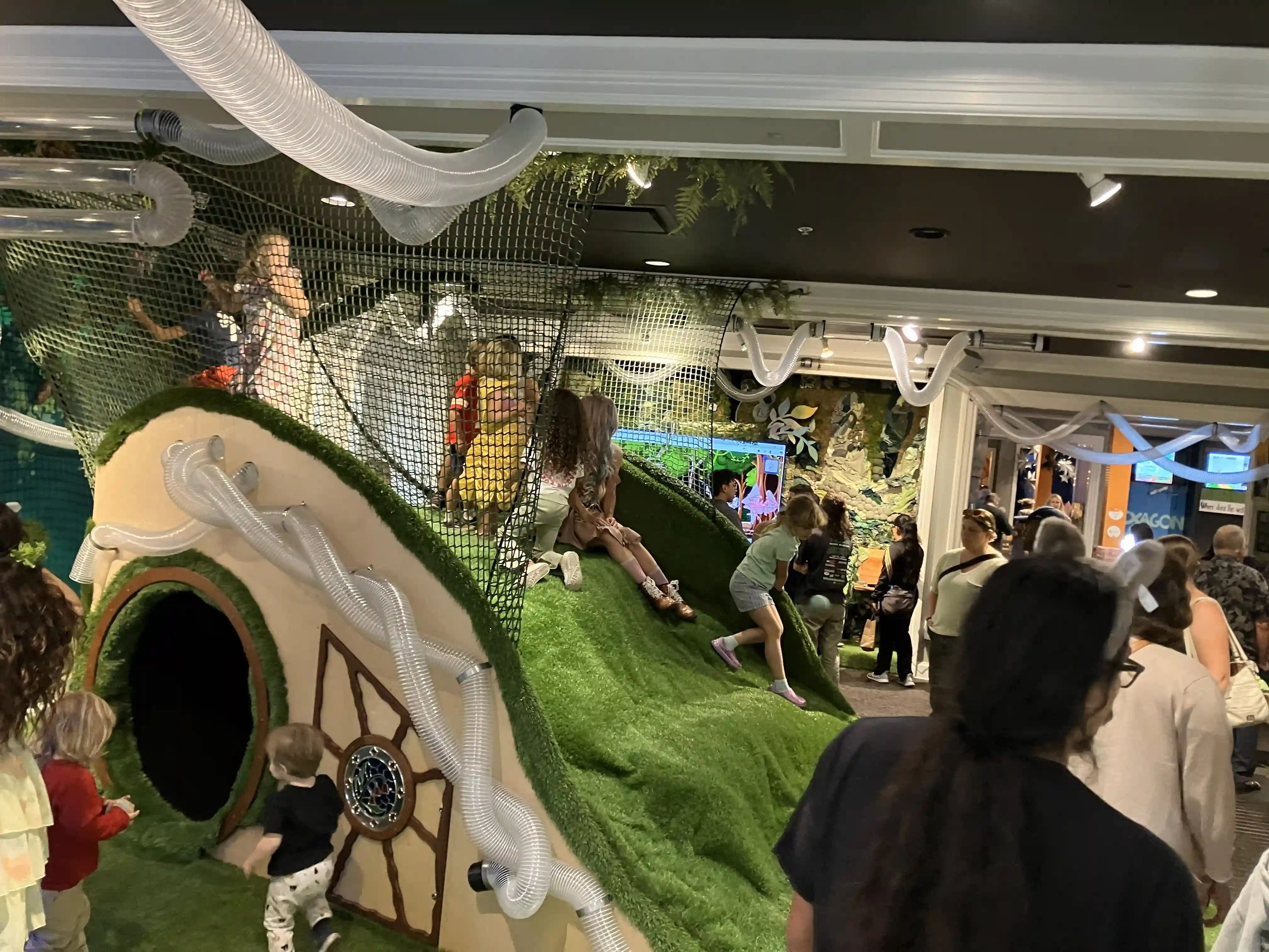The Enchanted Forest exhibit, featuring the Hobbit Hole structure with the "stained glass" window I designed, and the moss wall in the background.