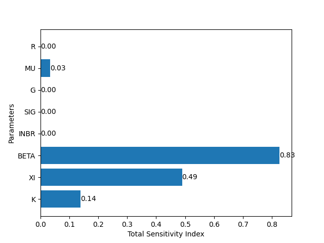 Figure 2. Sobol sensitivity analysis, measuring the sensitivity of all of the parameters to the number of infected snails at t=99. The parameter with the highest sensitivity index is beta, or β the force of infection on the snails. This suggests that the higher the infection level in the environment, the more successfully a resistance-inducing gene drive will perform!.