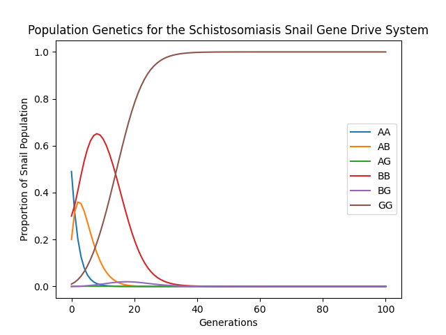We can use this transition matrix if we are given an initial population and some starting conditions. (Reminder: you can see the full system here.) Now, we can observe how the genotypes change over several generations. If the gene drive works well, then the proportion of snails homozygous for the gene drive (genotype GG) should rise fairly quickly.